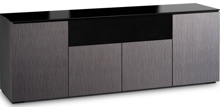The light look and feel of tall grasses is finely set in a vertical textured pattern. Alpi gray oak with black glass top and black feet work in unison, creating the cabinet's hi-tech facade.